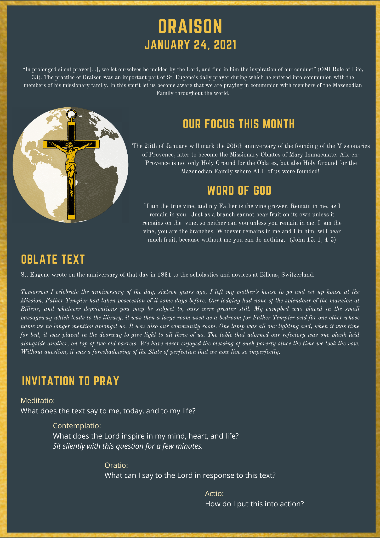 INVITACIÓN A NUESTRA ORAISON CON LA FAMILIA MAZENODIANA: 24 DE ENERO
