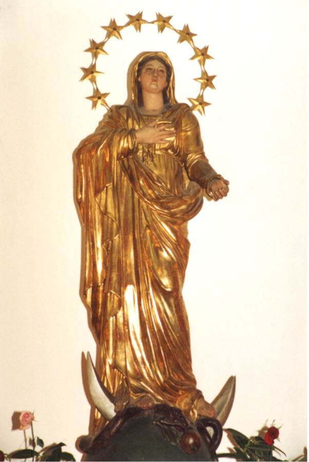 In the review, Missions O.M.I., of 1908, p. 279, we   find the following description: “Her head, crowned with twelve stars, is   lifted toward heaven in an attitude of prayer. She wears a golden veil, the   same colour as her long robe and her mantle. She is portrayed as the   Immaculate Conception with one foot standing on the crescent moon and the   other upon a serpent she is crushing. Her right hand is resting on her heart   while her other hand is open, spreading graces on her children who are   praying to her.”