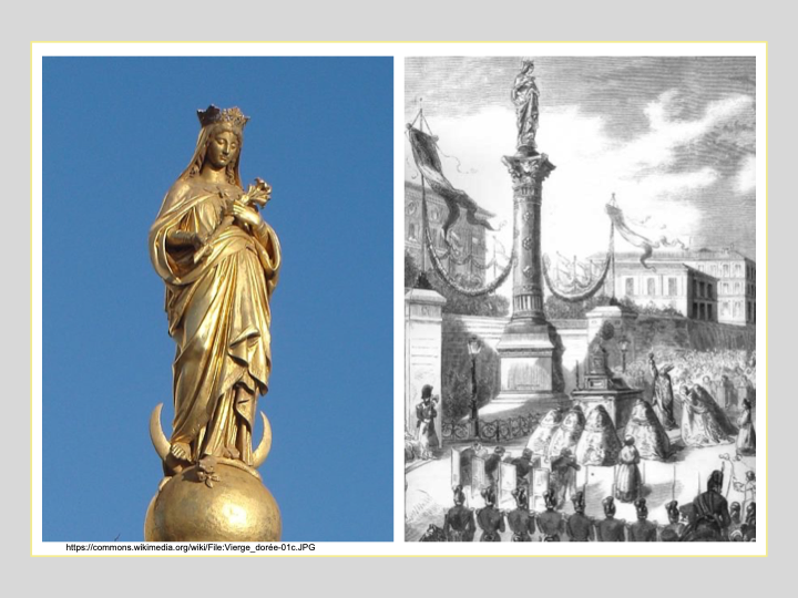 Such was the name given by the people of Marseilles to the monument erected by Bishop de Mazenod in honour of Mary Immaculate in order to keep fresh in the minds of people the definition of the dogma of the Immaculate Conception proclaimed by Pope Pius IX on December 8, 1854.