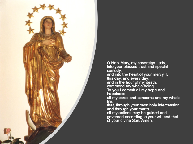 I think of that as I begin to proclaim: “O Holy Mary, my sovereign Lady, into your blessed trust and special custody, and into the heart of your mercy, I,