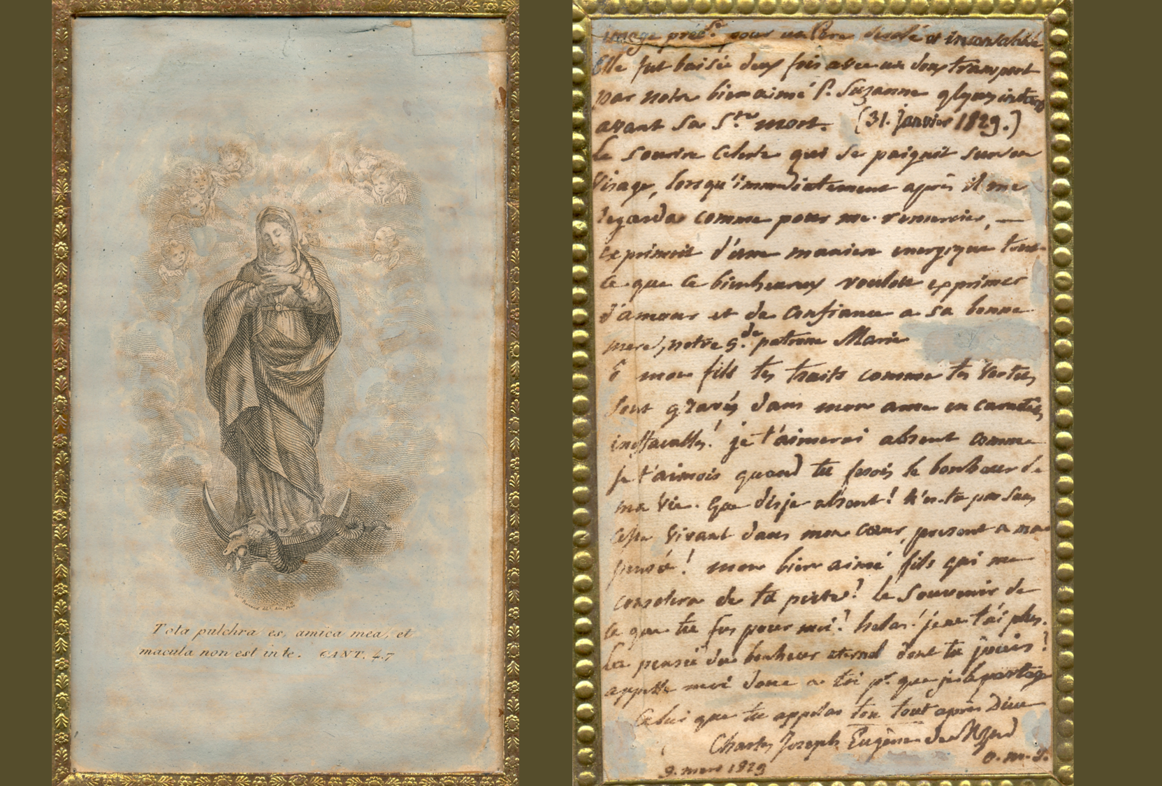 Image préc[ieu]se pour un père désolé et inconsolable. Elle fut baisée deux fois avec un doux transport par notre bien-aimé P. Suzanne, quelques instants avant sa s[ain]te mort (31 janvier 1829).